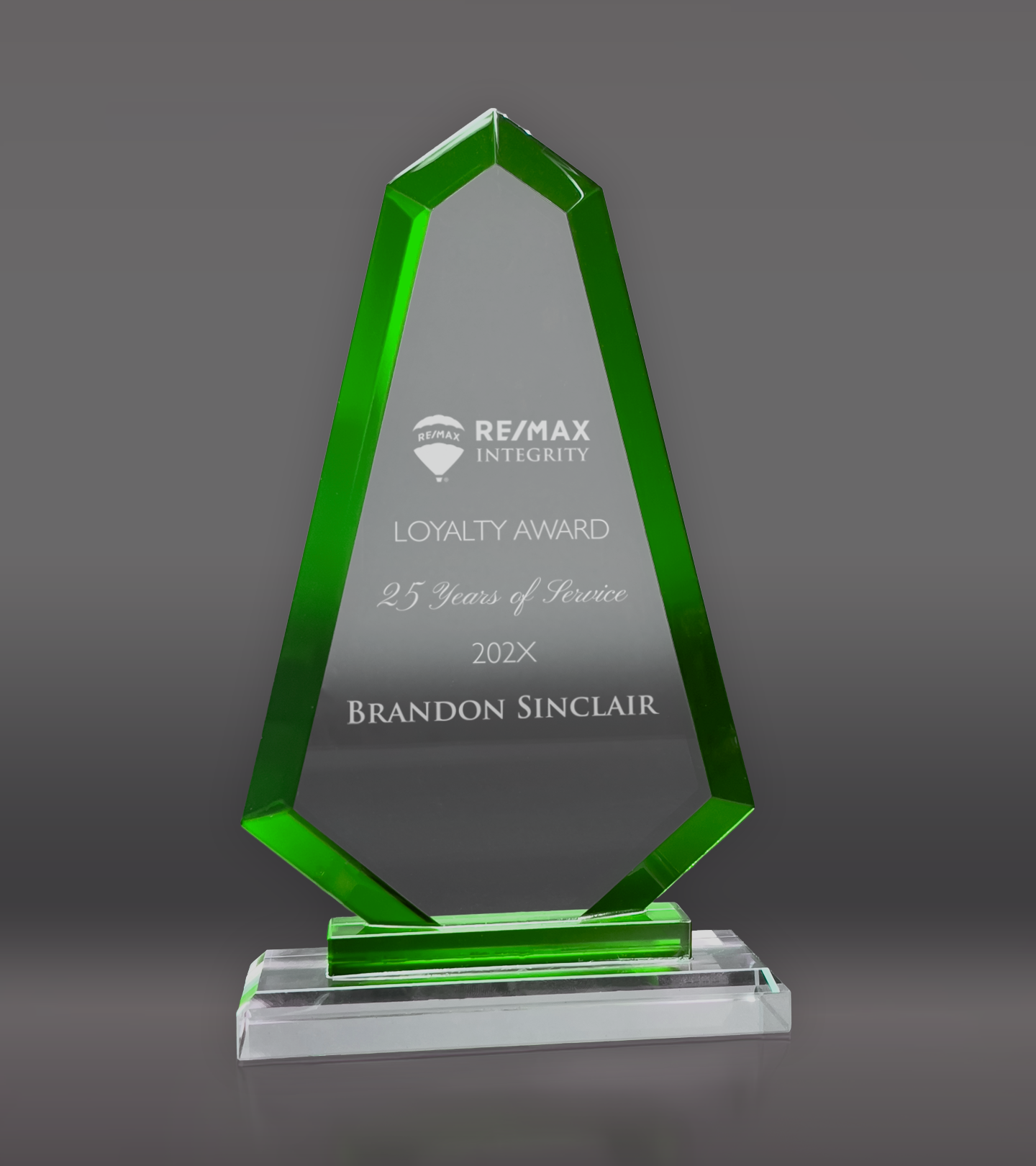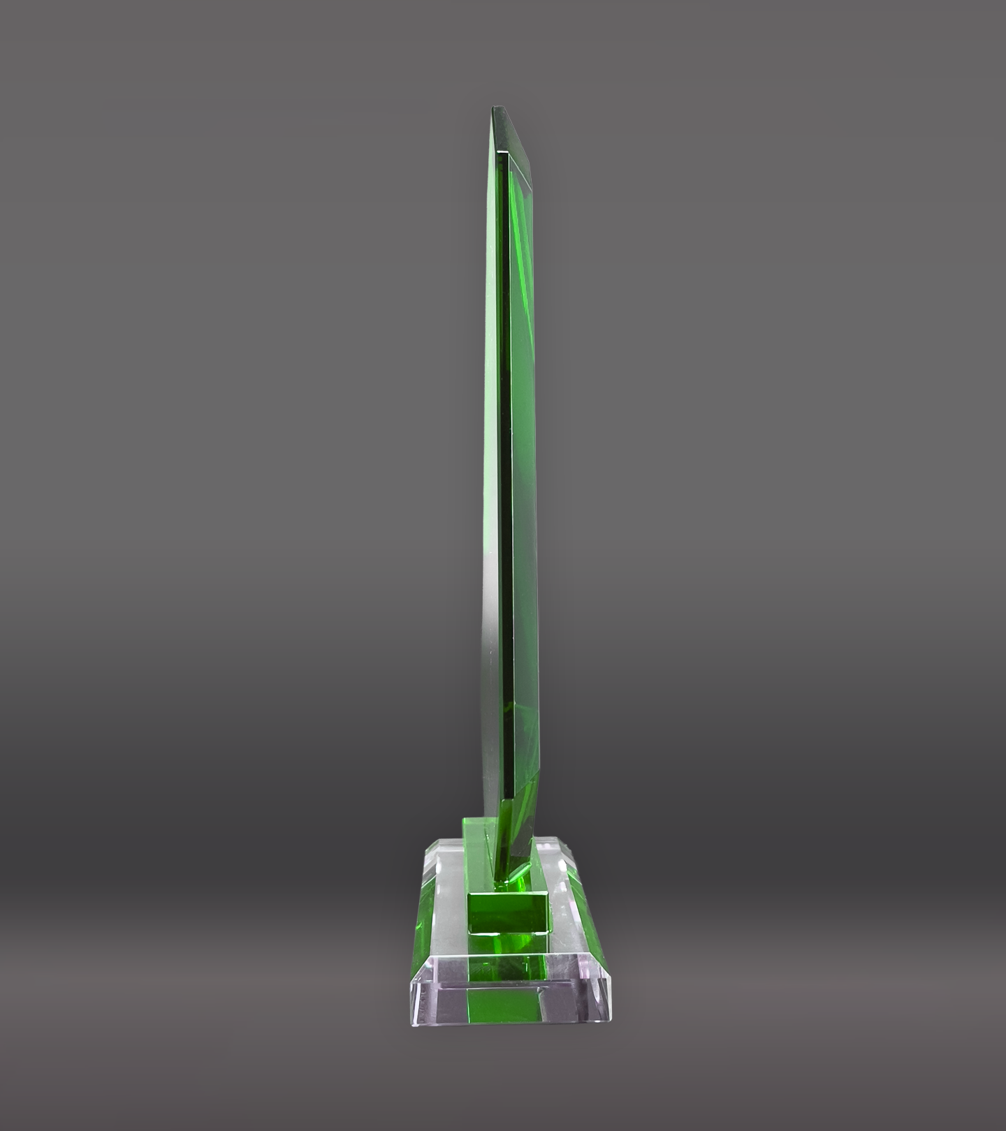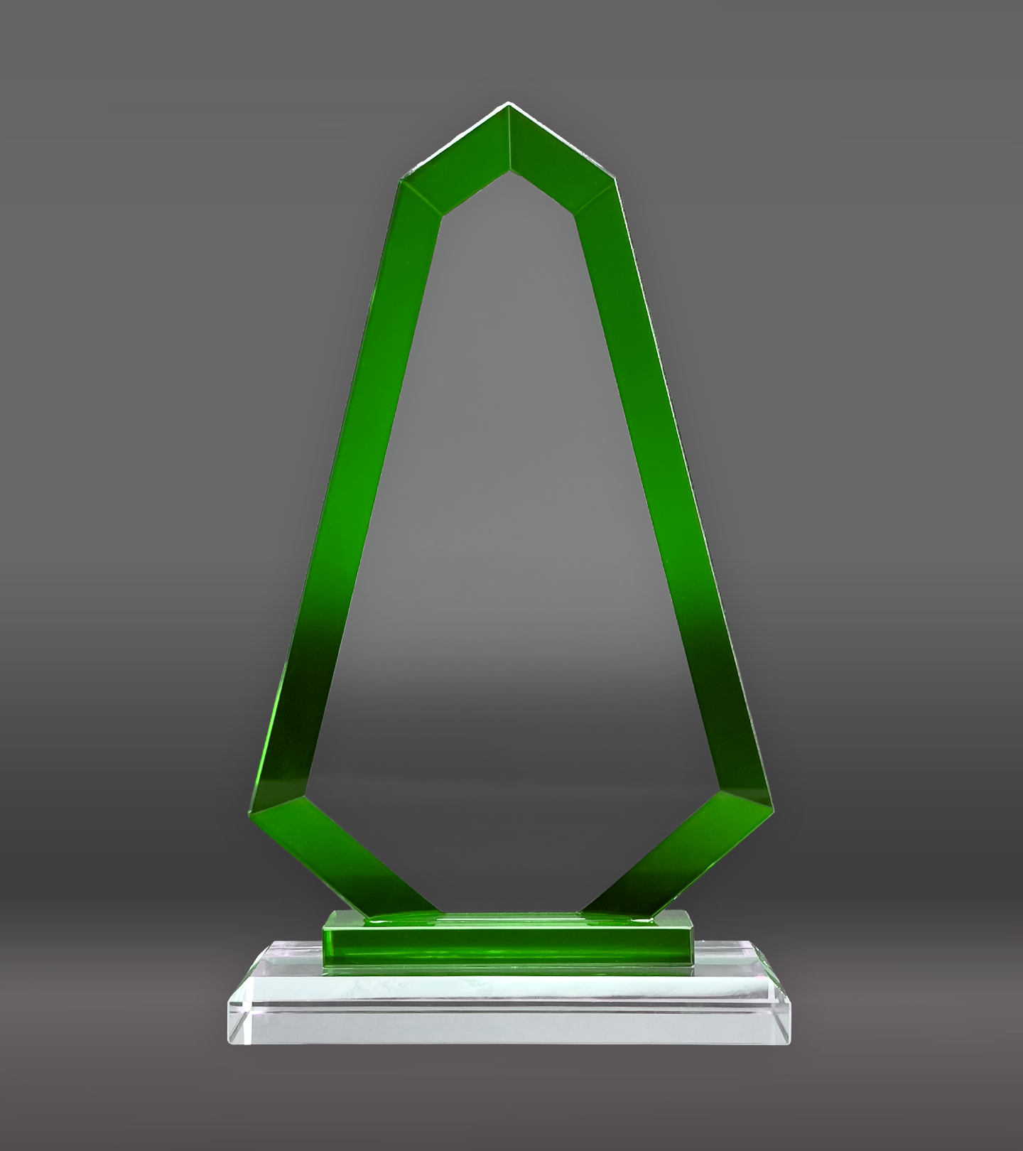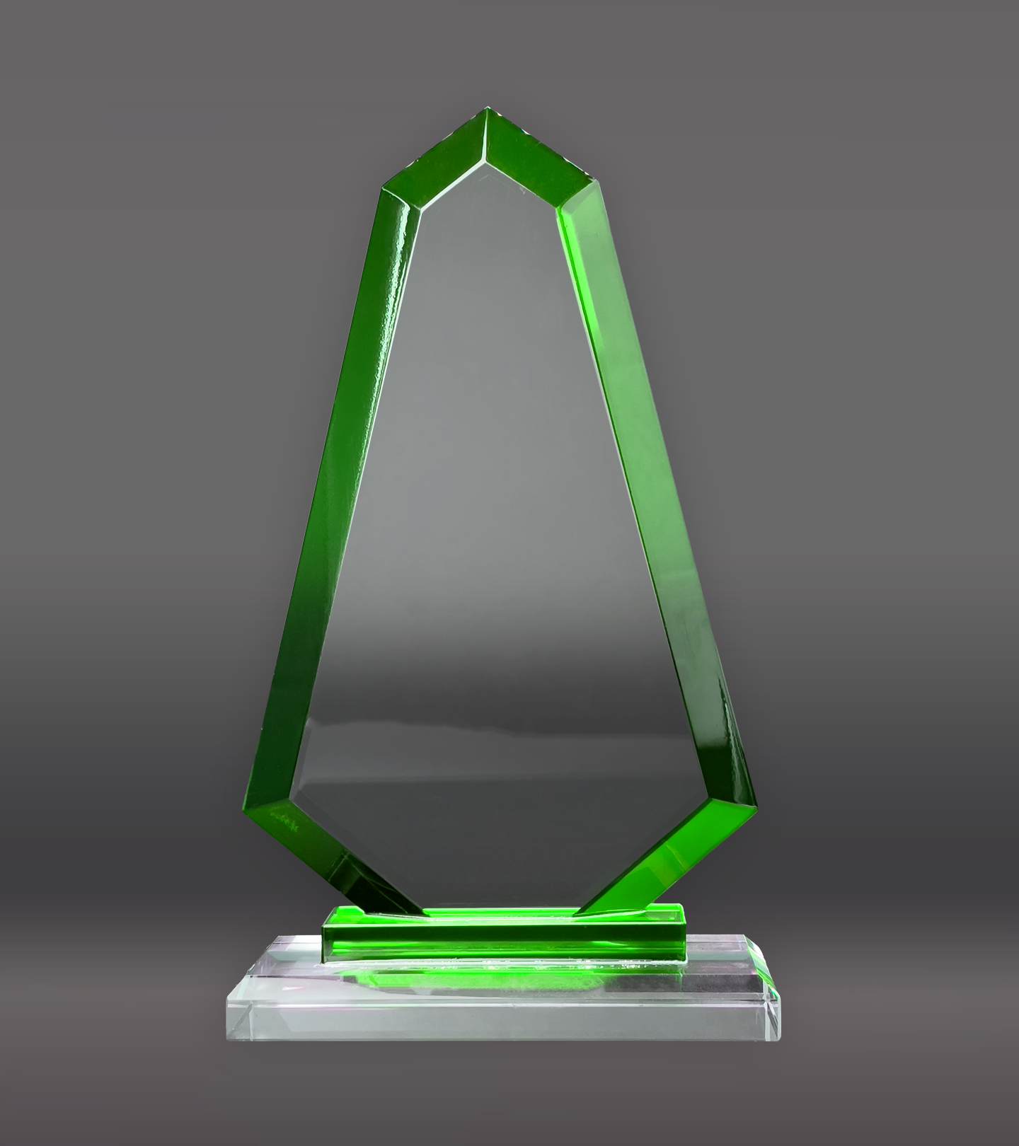 The Green Trim Apex Crystal Award showcases a striking green border and includes complimentary unlimited laser engraving for a personalized finish.