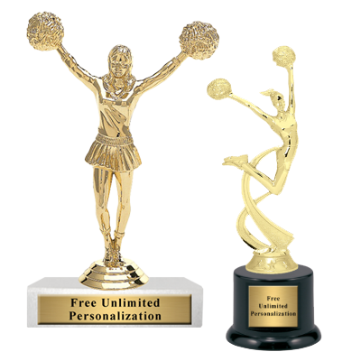 These classic designs are easy to pick out, with golden cheer figures in action atop a marble pedestal base. They're sure to please the whole squad!