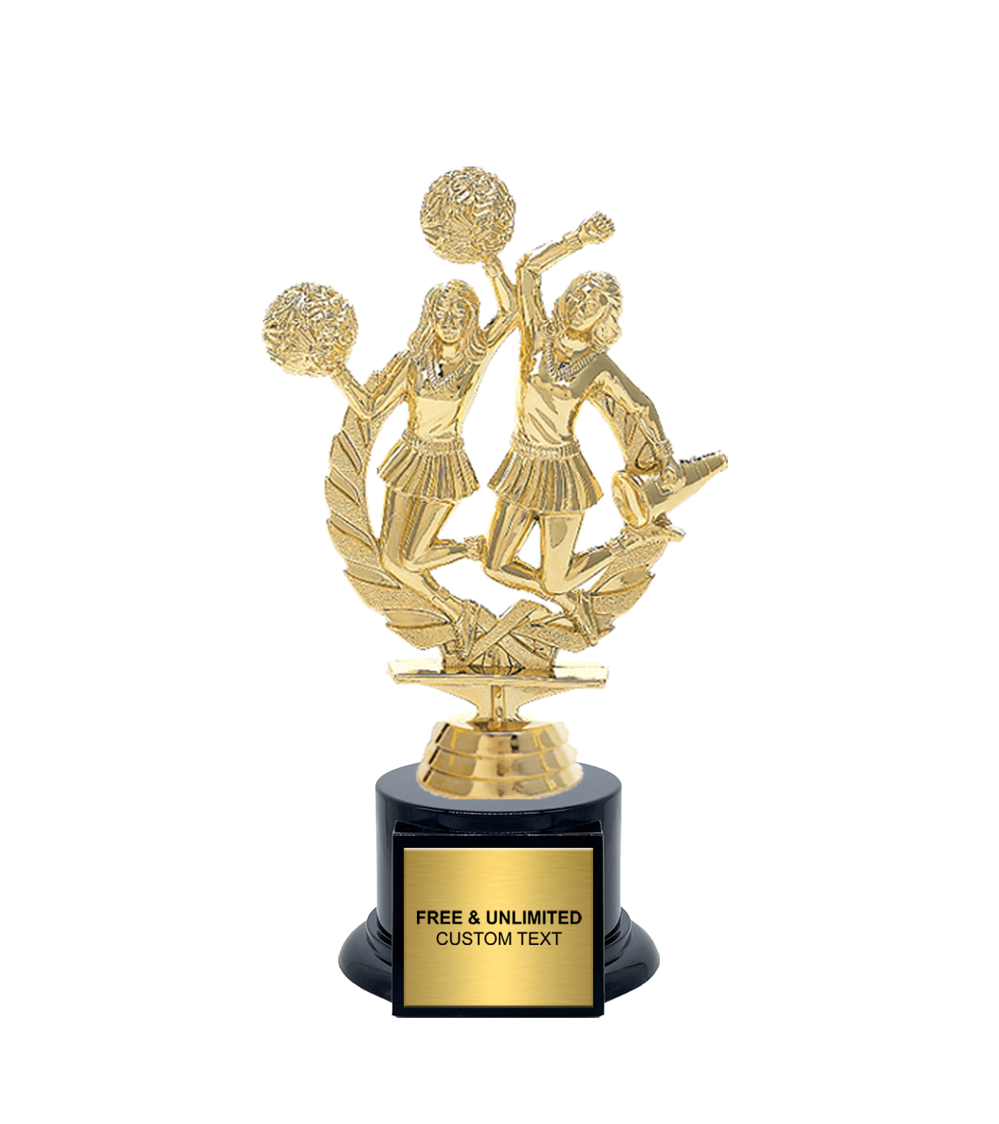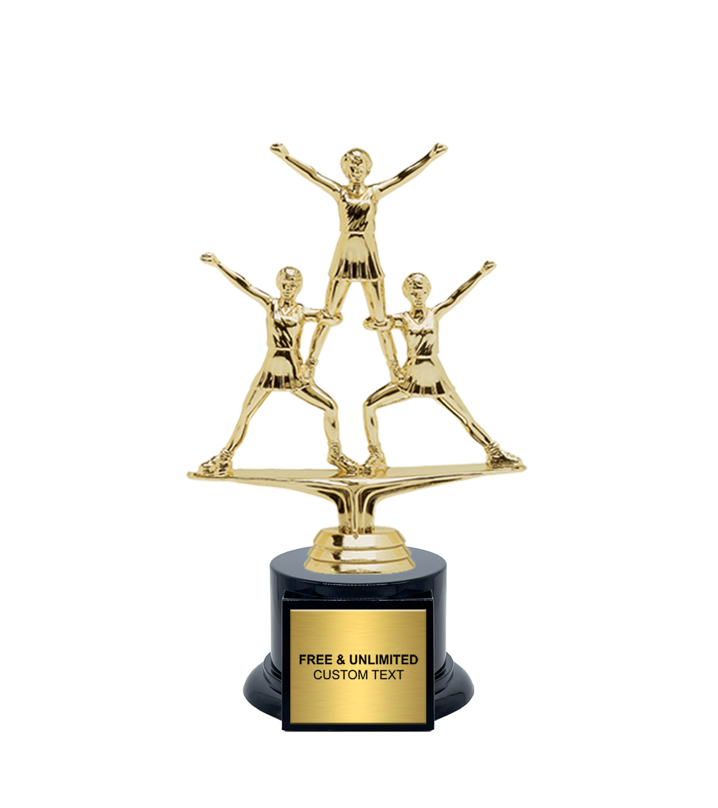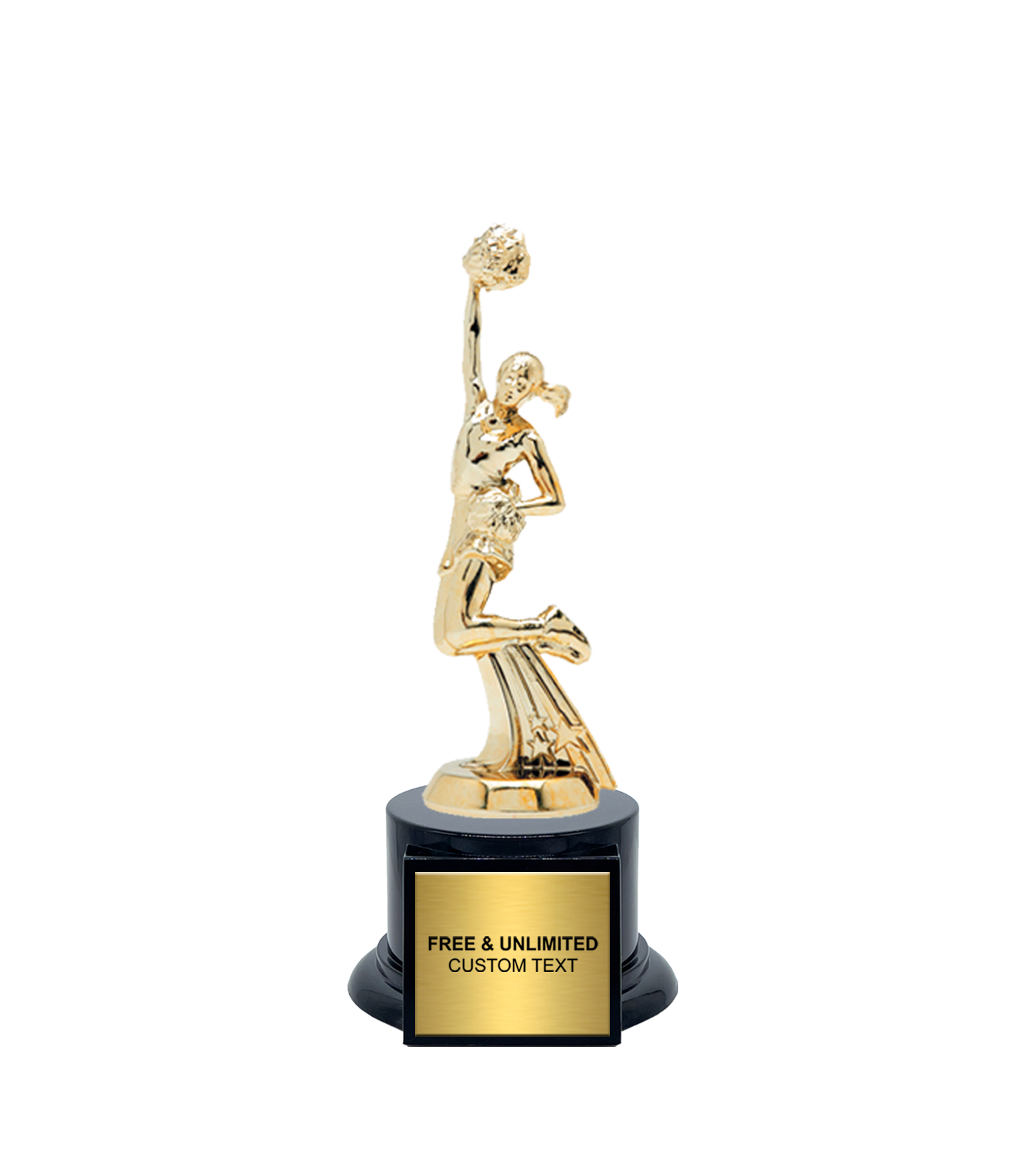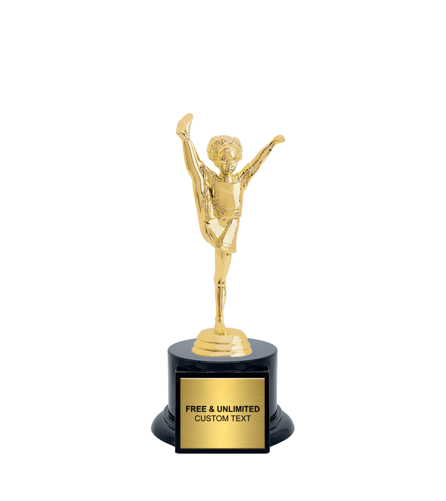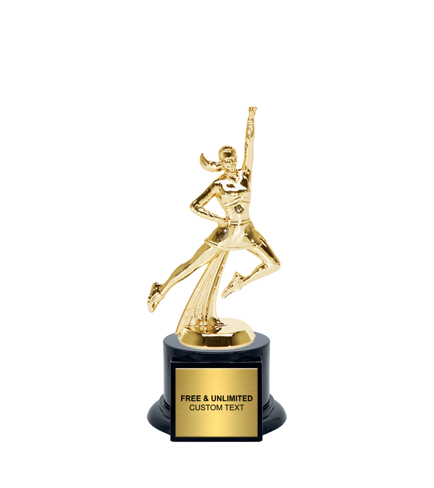 Celebrate victory with our Legacy Cheer Trophy! This dazzling award features a golden cheerleader figure striking a pose on a sleek black round base. Every trophy comes with a gold flexi-brass plate, custom laser engraved with your message - and guess what? The engraving is totally free and unlimited! Perfect for recognizing those high-flying spirit stars on your squad!