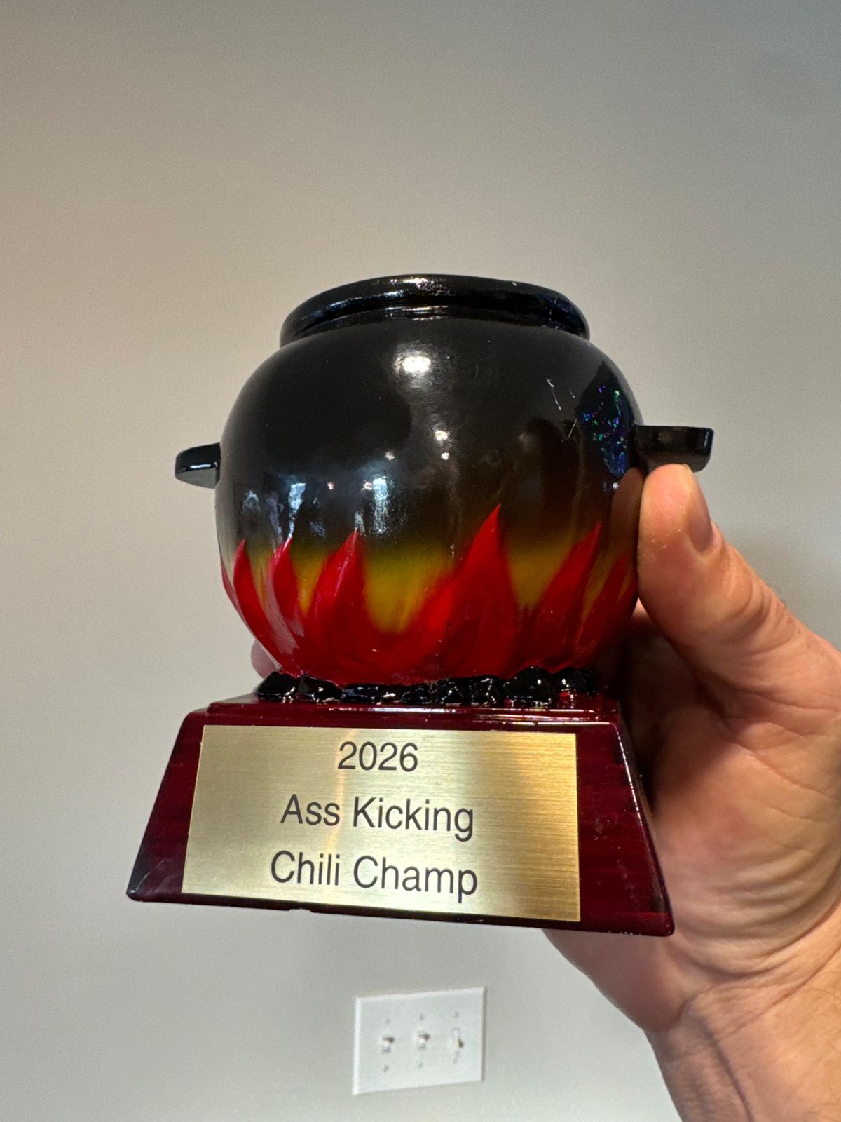 This Big Chili Pot Cooking Trophy is the perfect tool for passionate, chili-loving chefs everywhere. With a classic black cauldron on a smoldering Fire all atop a striking Cherry Base, this trophy will have you cooking up award-winning recipes in no time. So, what are you waiting for? Get cooking!