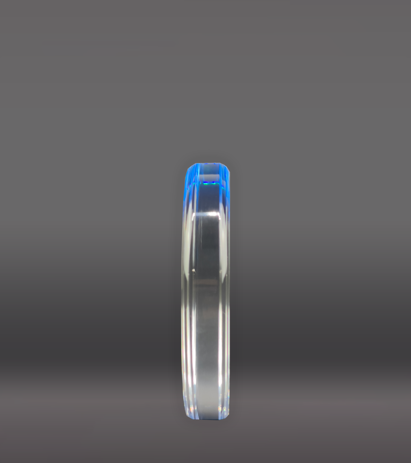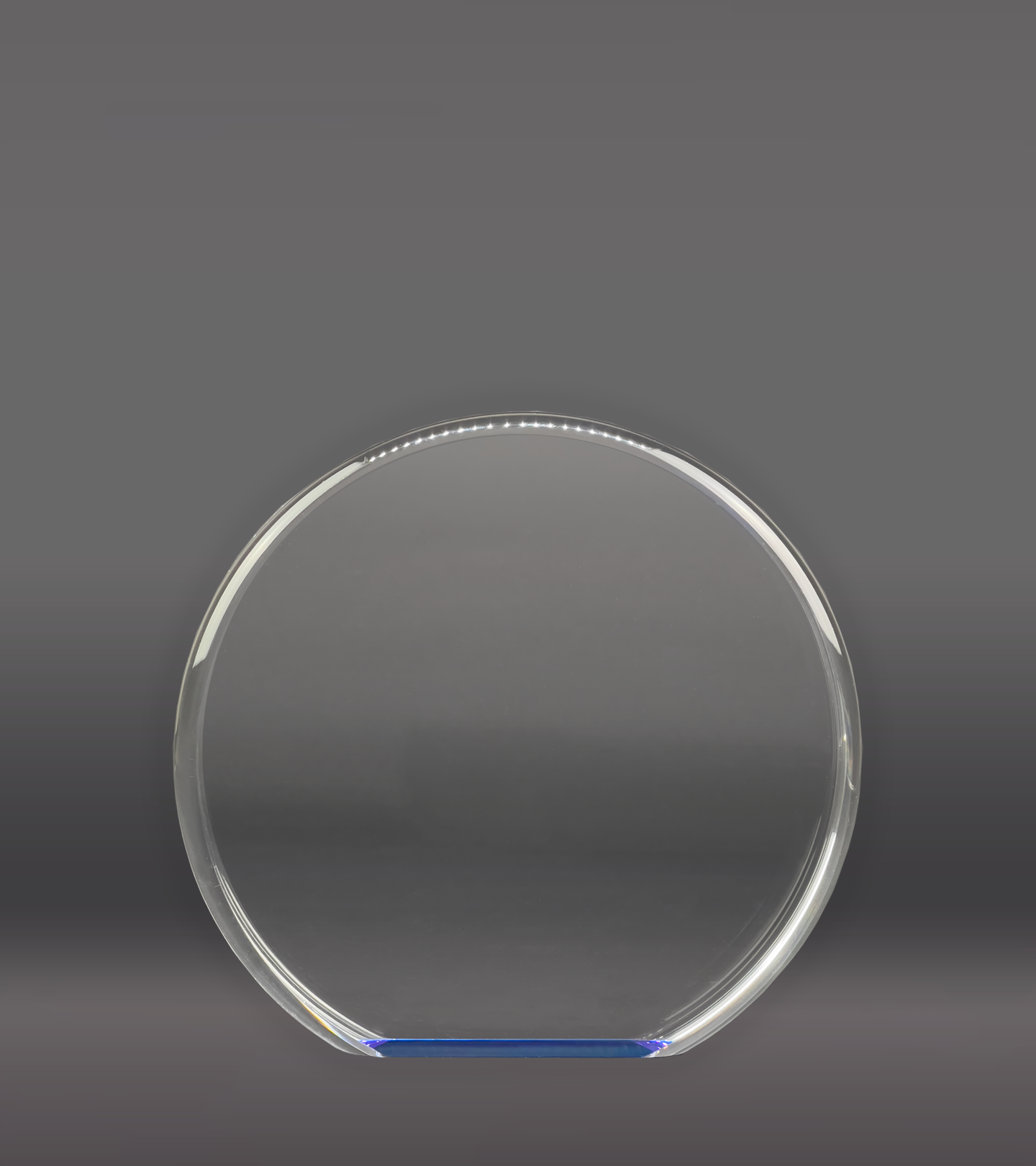 The Color Printed Blue Reflective Circle Acrylic Award features a clear acrylic design enhanced by a rich blue bottom. This vibrant color shines through the circular award, creating an eye-catching effect that captivates attention.