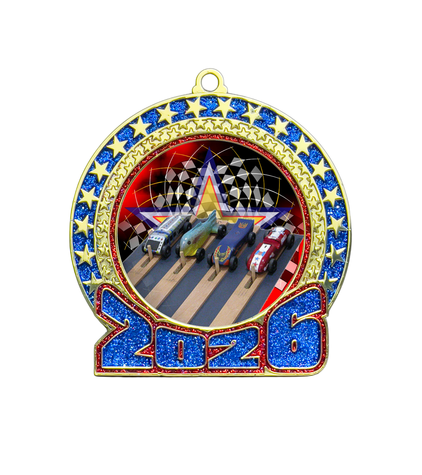 Our  2026 Red and Blue Glitter Derby Insert Medals are a Low Priced Custom Medal that can be customized with any one of our derby stickers. This 2026 medal comes with a laminated insert sticker. Make 2026 a year defined by victory and achievement.