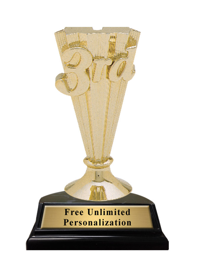 This Derby Trophy - Third Place will let the boys in your troop show off their great effort! Free personalization on the black marble finish base of the award. First Place Riser leads up the Derby Car Topper of your choice. Enjoy these phenomenal trophies!