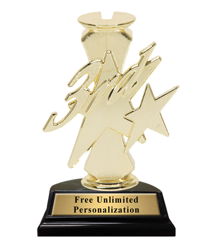 This Derby 3rd Place Star Riser Trophy will let your participants show off their great effort! Free personalization on the black, weighted plastic base of the award. Third Place Riser leads up to the topper of your choice. Enjoy these phenomenal trophies!