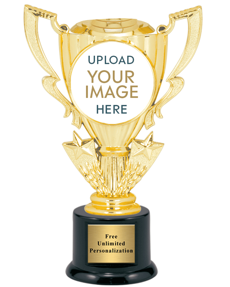 Award victory in every arena with the Champion Cup Custom Insert Trophy. This glorious gold plastic trophy comes in a variety of activities and sports, featuring a number of exquisite trophy figures. The shape of the trophy has a stunning resemblance to a real gold trophy cup, with a 2 inch insert area in the center. A traditionally-sized award with big looks at an affordable price! Upload your own logo, design, or photograph to make this trophy completely custom. Your personalized engraving is free and unlimited.