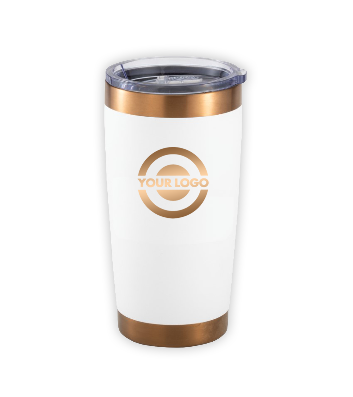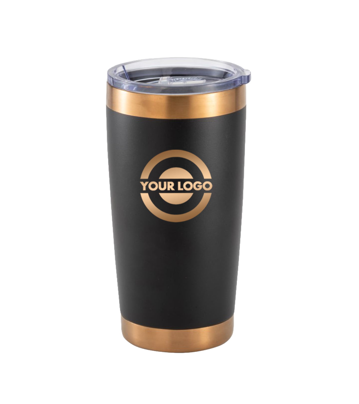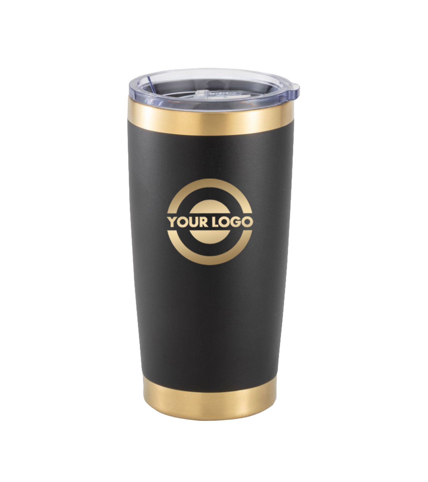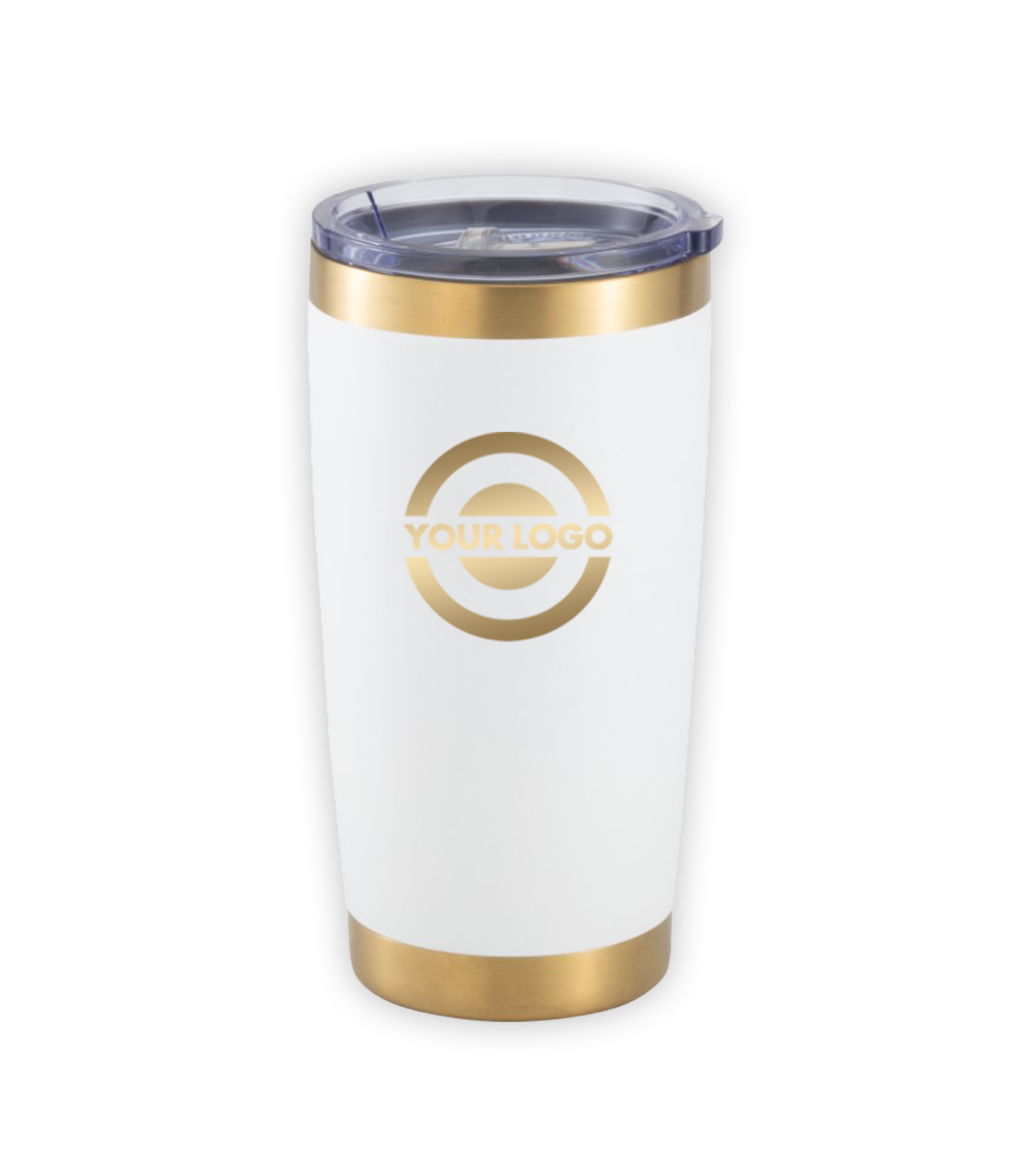Sip like royalty with this 20 oz Custom Insulated Tumbler, available in black or white, each accented by a sleek gold or shimmering bronze accent for that extra shine. Add a logo or custom message with out free and unlimited laser engraving!