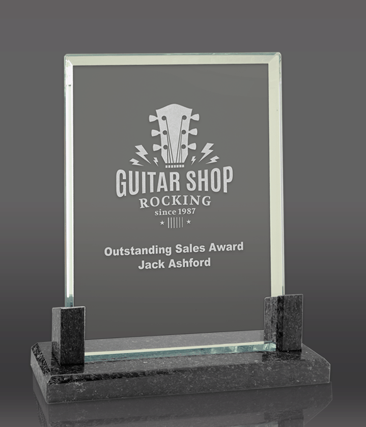 The Rectangle Glass Award with Black Marble Base is a modern achievement award that exudes a feeling of strength, accomplishment, and steadfast leadership. The carefully engraved glass and weighted marble base make this an award that will hold up over time and be cherished for years to come. Engrave your personalized message and your company logo at no additional cost.