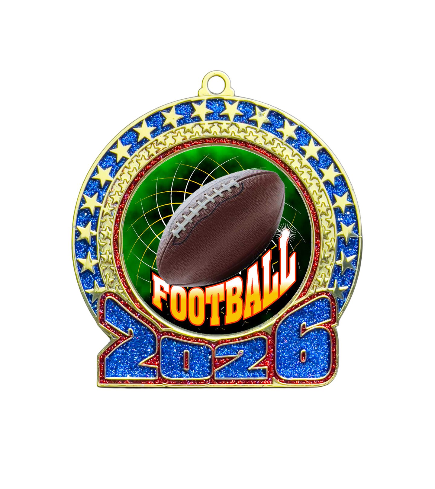 Our 2026 Red and Blue Glitter Football Insert Medals are a Low Priced Custom Medal that can be customized with any one of our Football stickers. This 2026 medal comes with a laminated insert sticker. Make 2026 a year defined by victory and achievement.