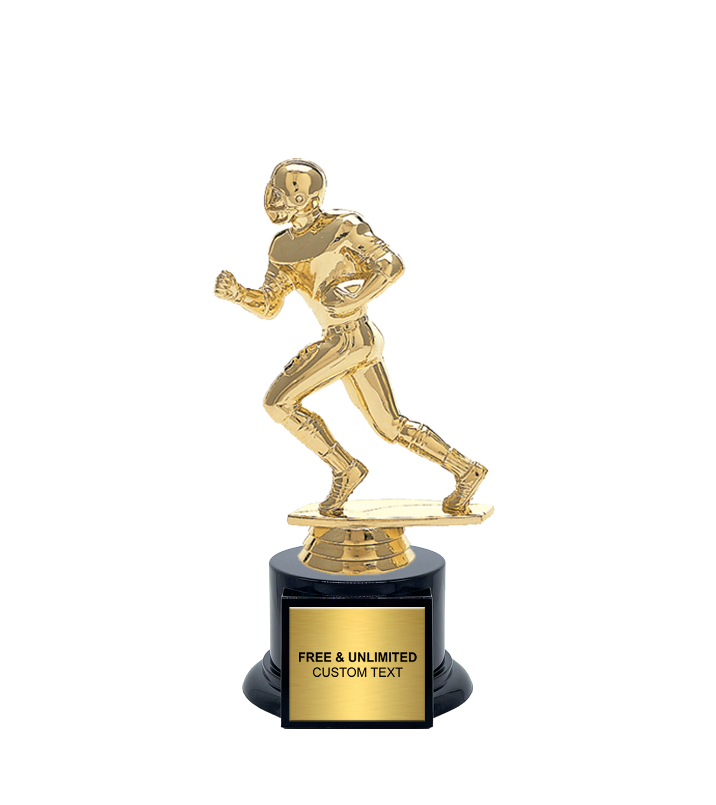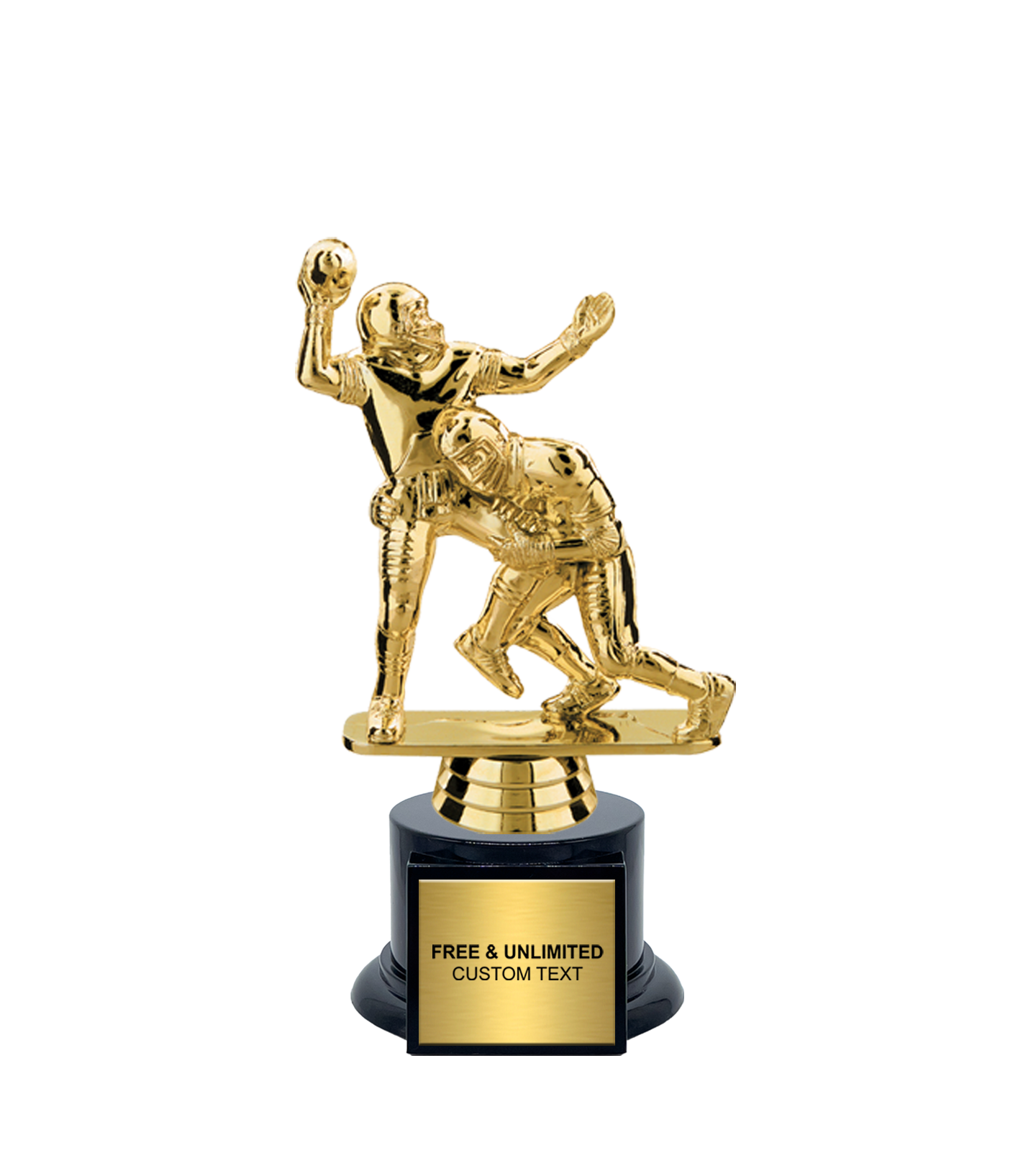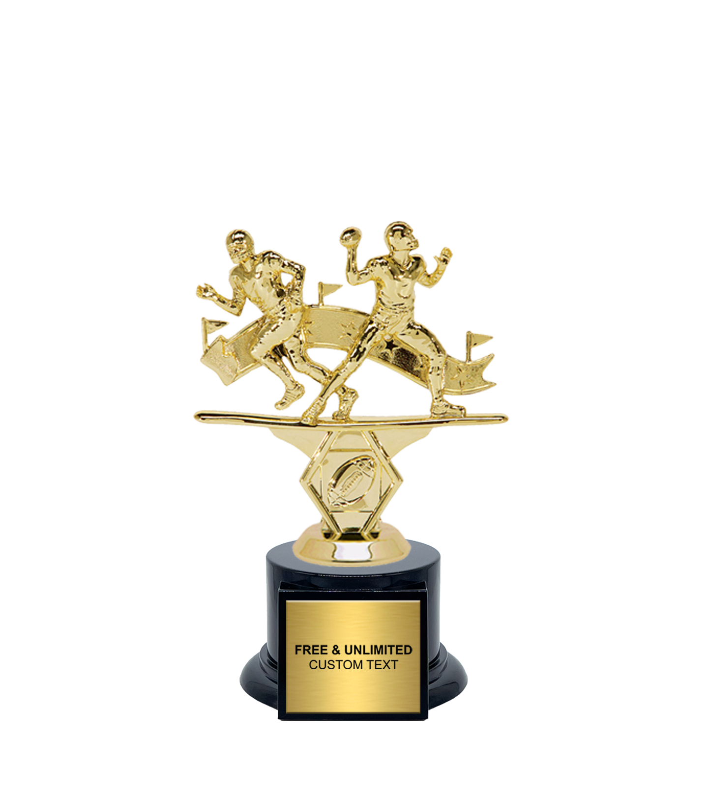 Celebrate victories with the Legacy Football Trophy, showcasing a selection of shiny golden football toppers perched on a sleek black round base. The front proudly displays a custom laser-engraved gold flexi-brass plate, making every win feel extra special. And best of all? Engraving is free and unlimited.
