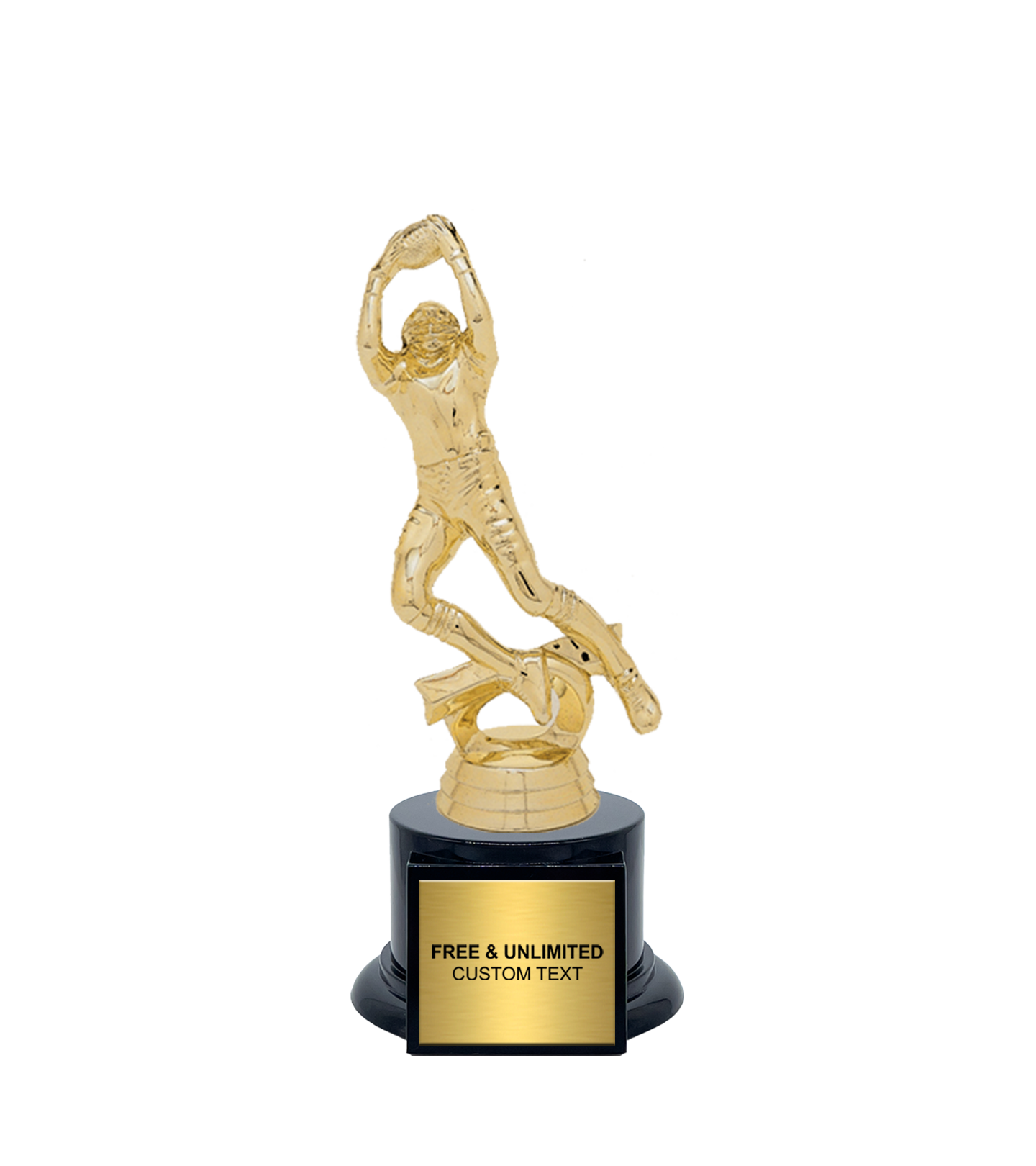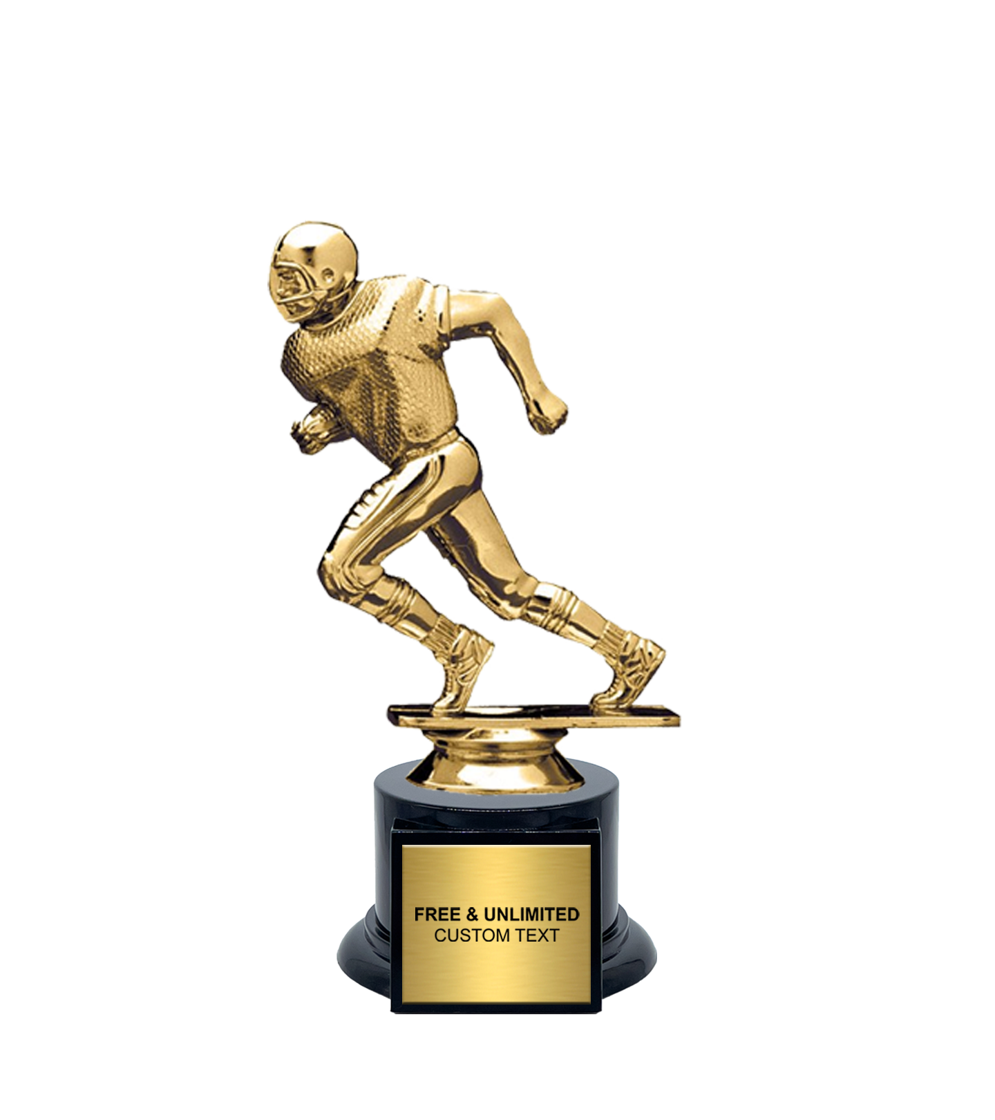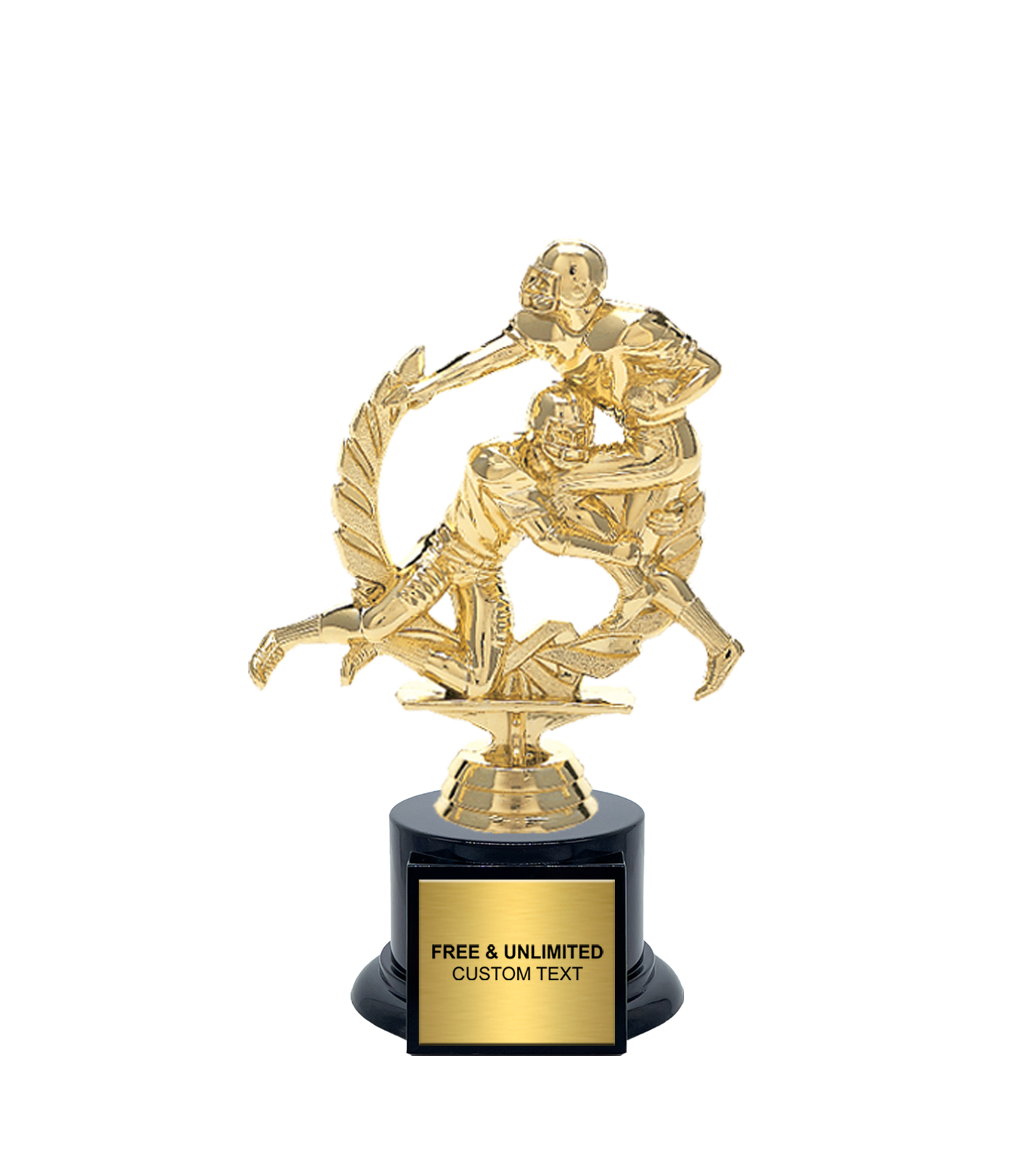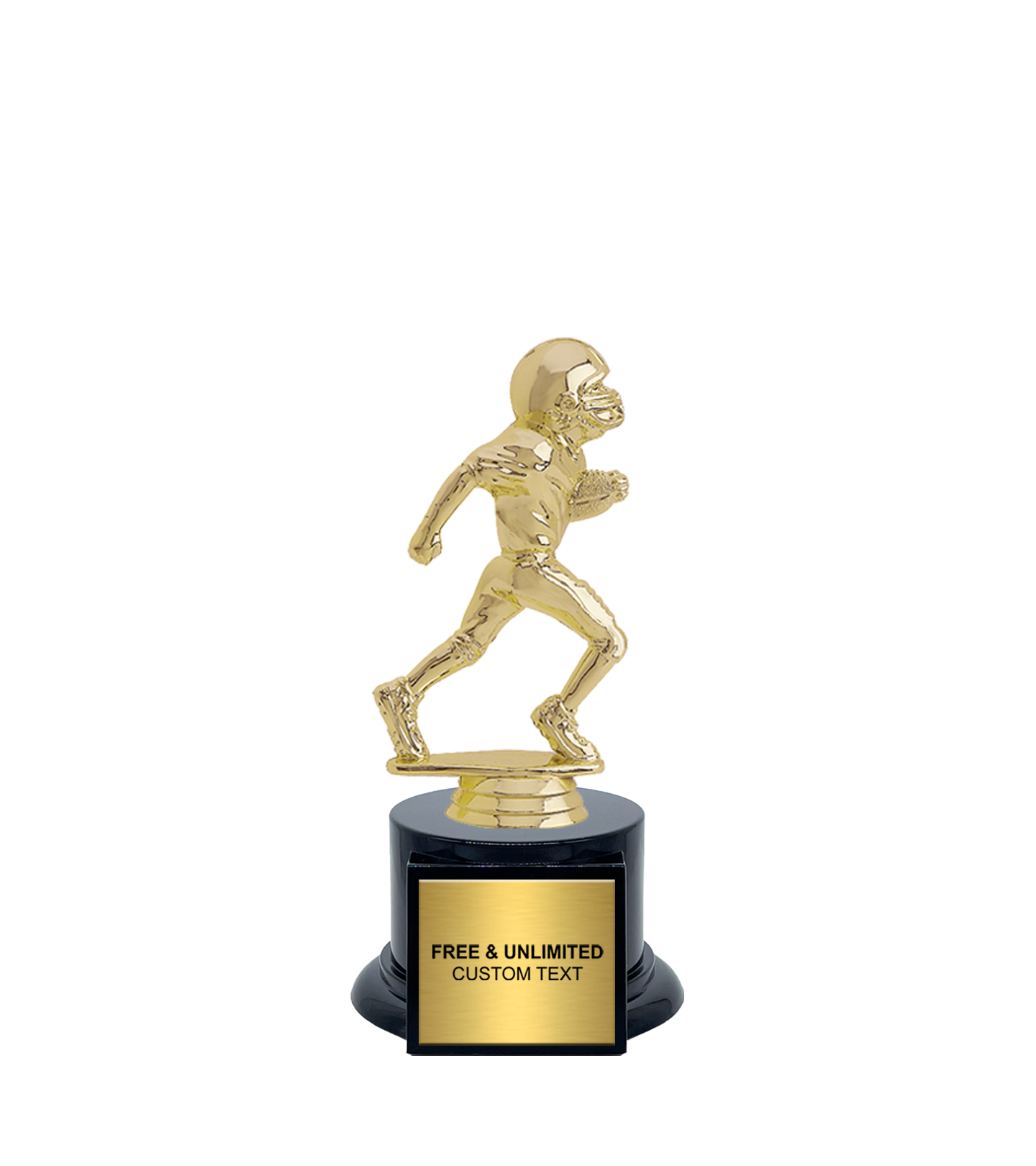 Celebrate victories with the Legacy Football Trophy, showcasing a selection of shiny golden football toppers perched on a sleek black round base. The front proudly displays a custom laser-engraved gold flexi-brass plate, making every win feel extra special. And best of all? Engraving is free and unlimited.