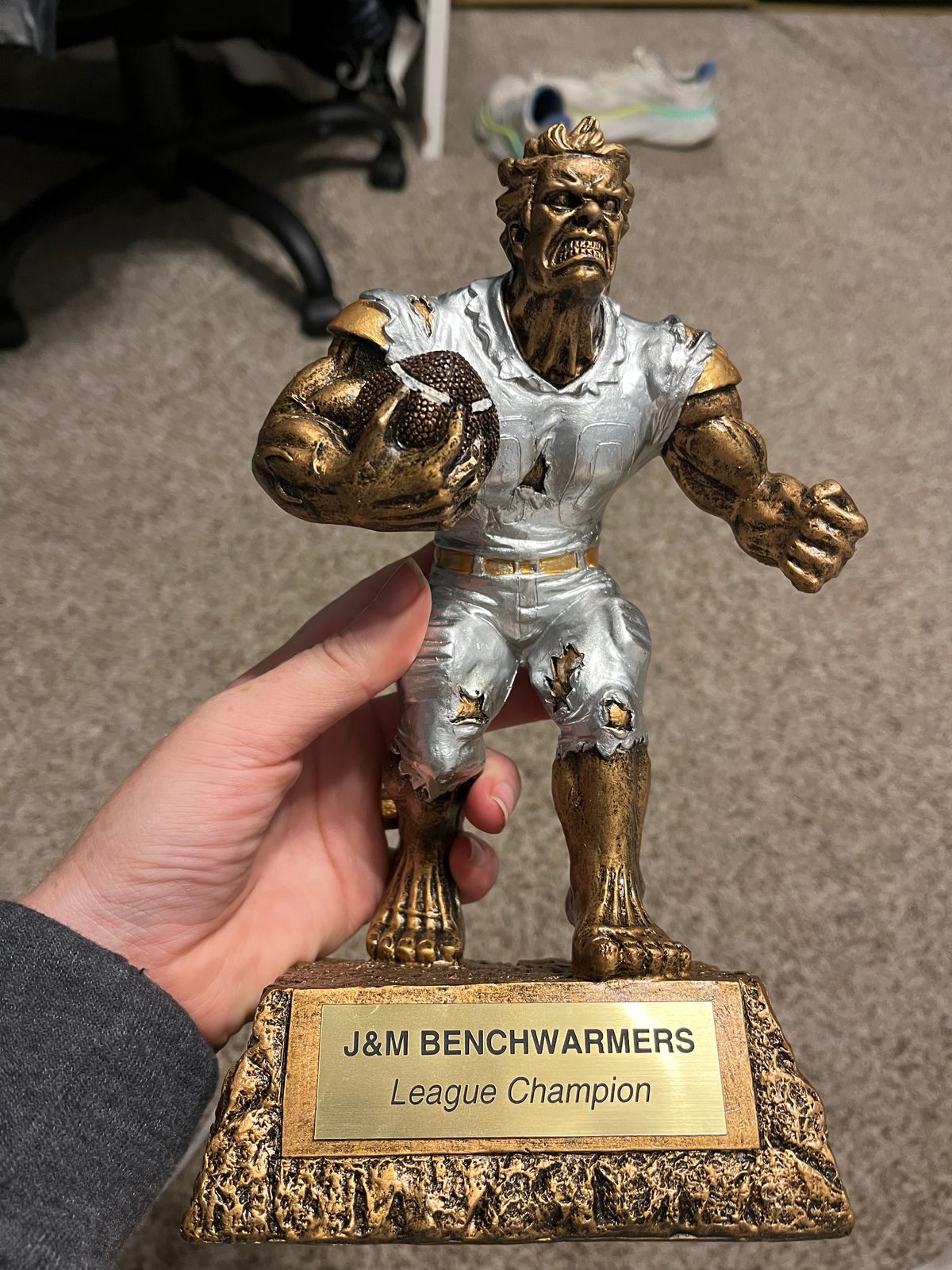 Are you ready to take the field with a champion? Let the Mega Monster Football Trophy be your team's source of power and pride. Its bold 9.5 inch bronze frame and silver painted clothes, will never fail to inspire a feeling of victory. Dare to be a winner!