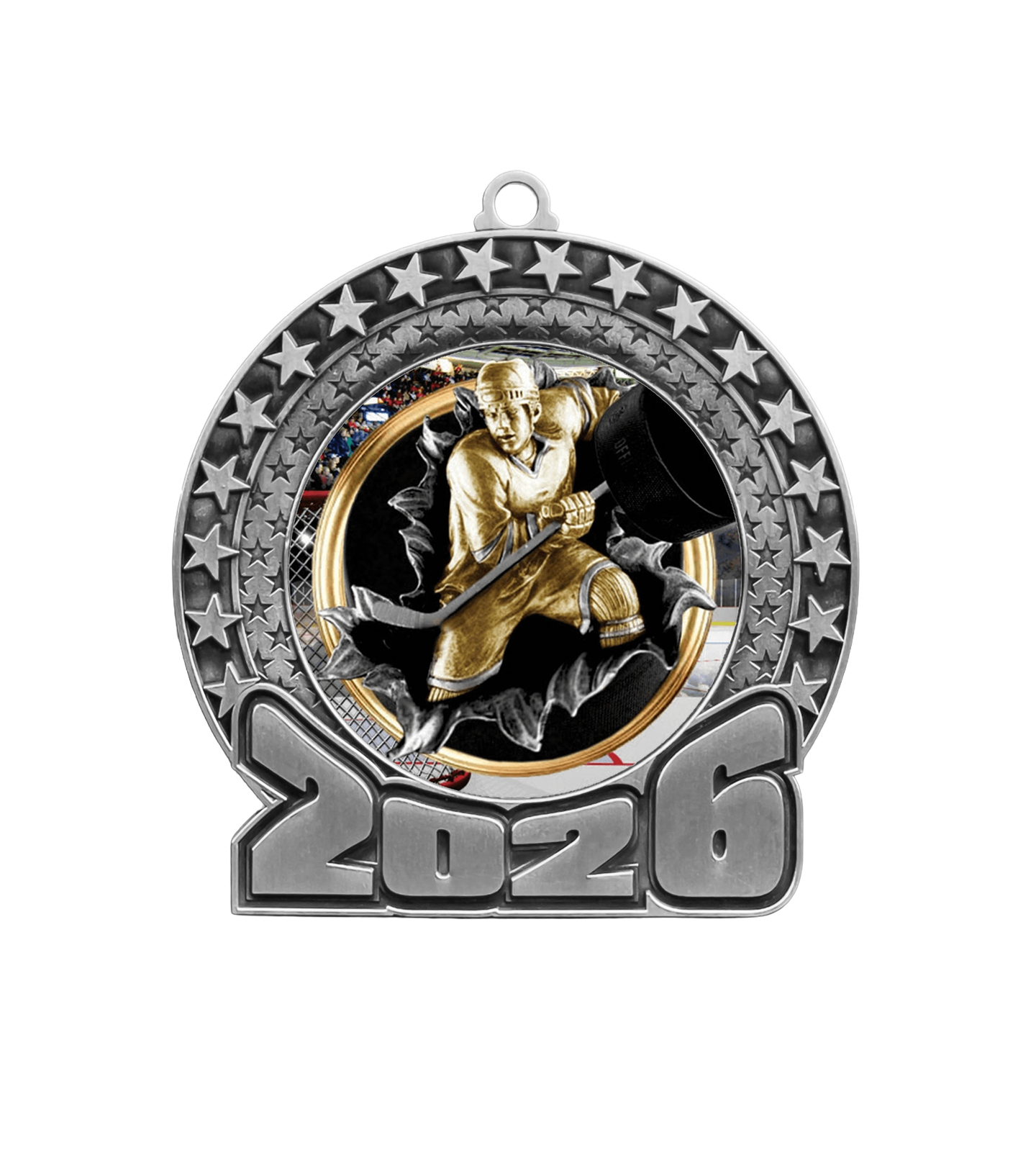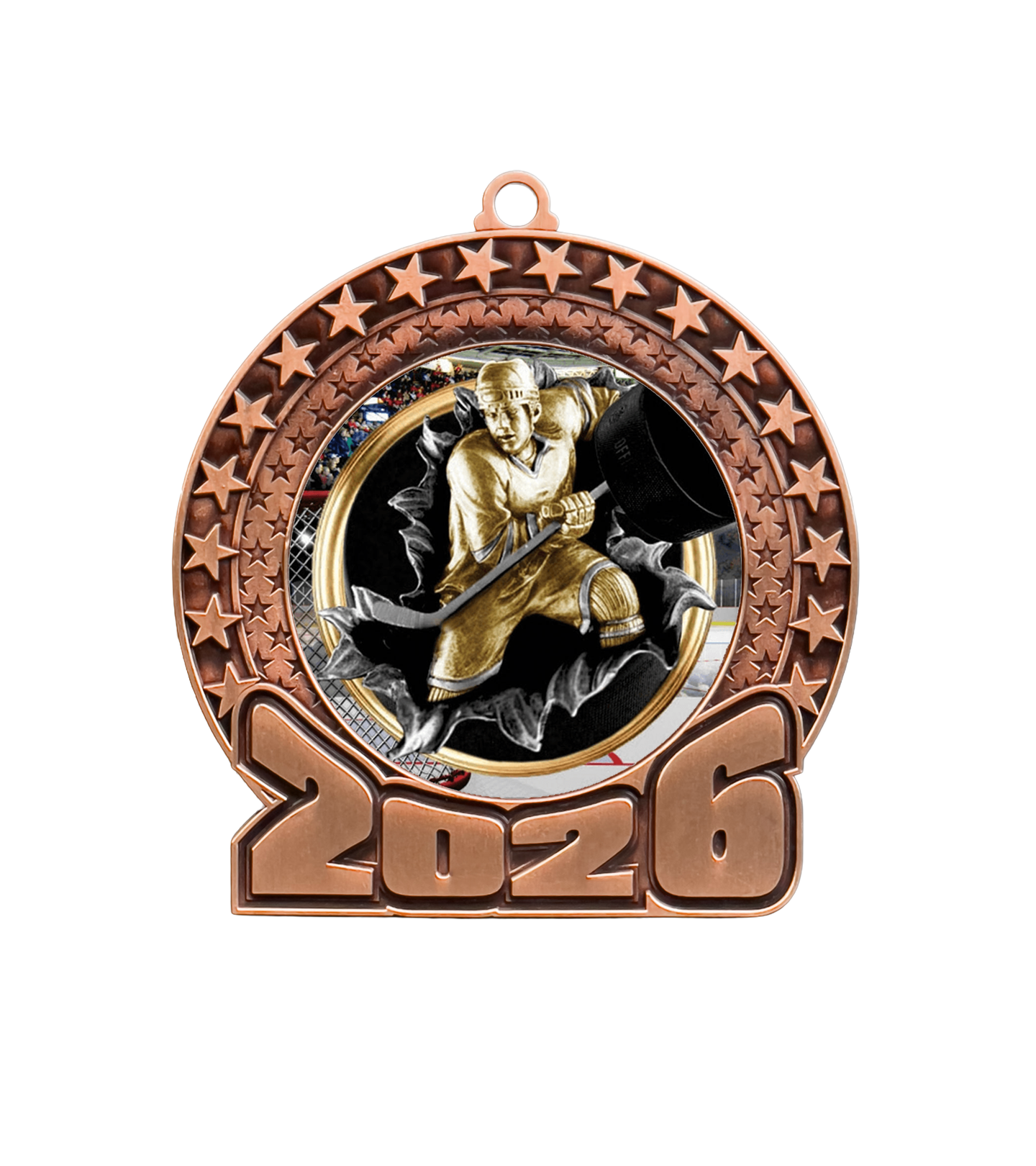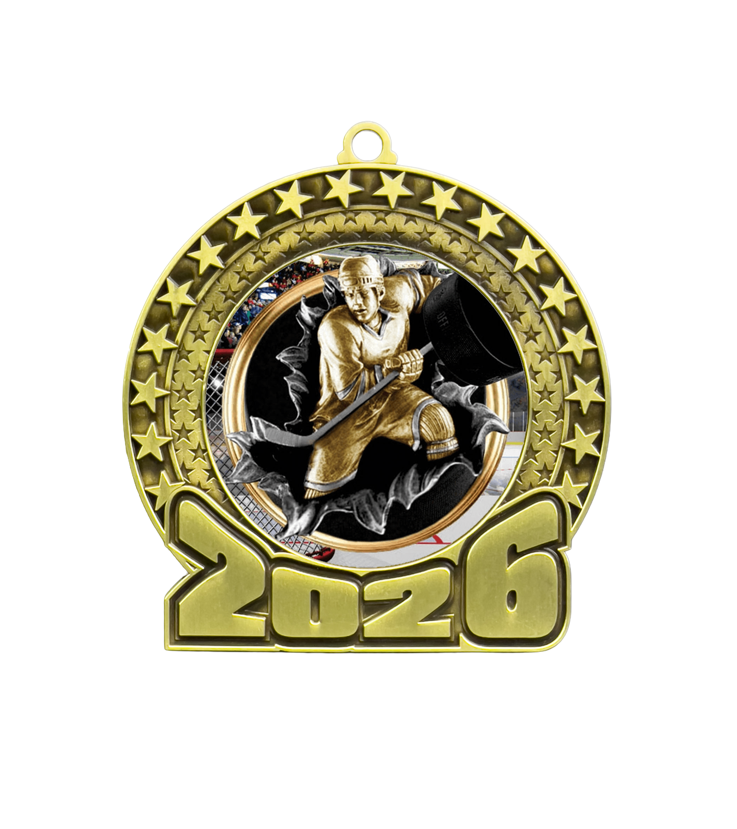 Our 2026 Hockey Insert Medals are a Low Priced Custom Medal that can be customized with any one of our Hockey stickers. This 2026 medal comes with a laminated insert sticker. Make 2026 a year defined by victory and achievement.