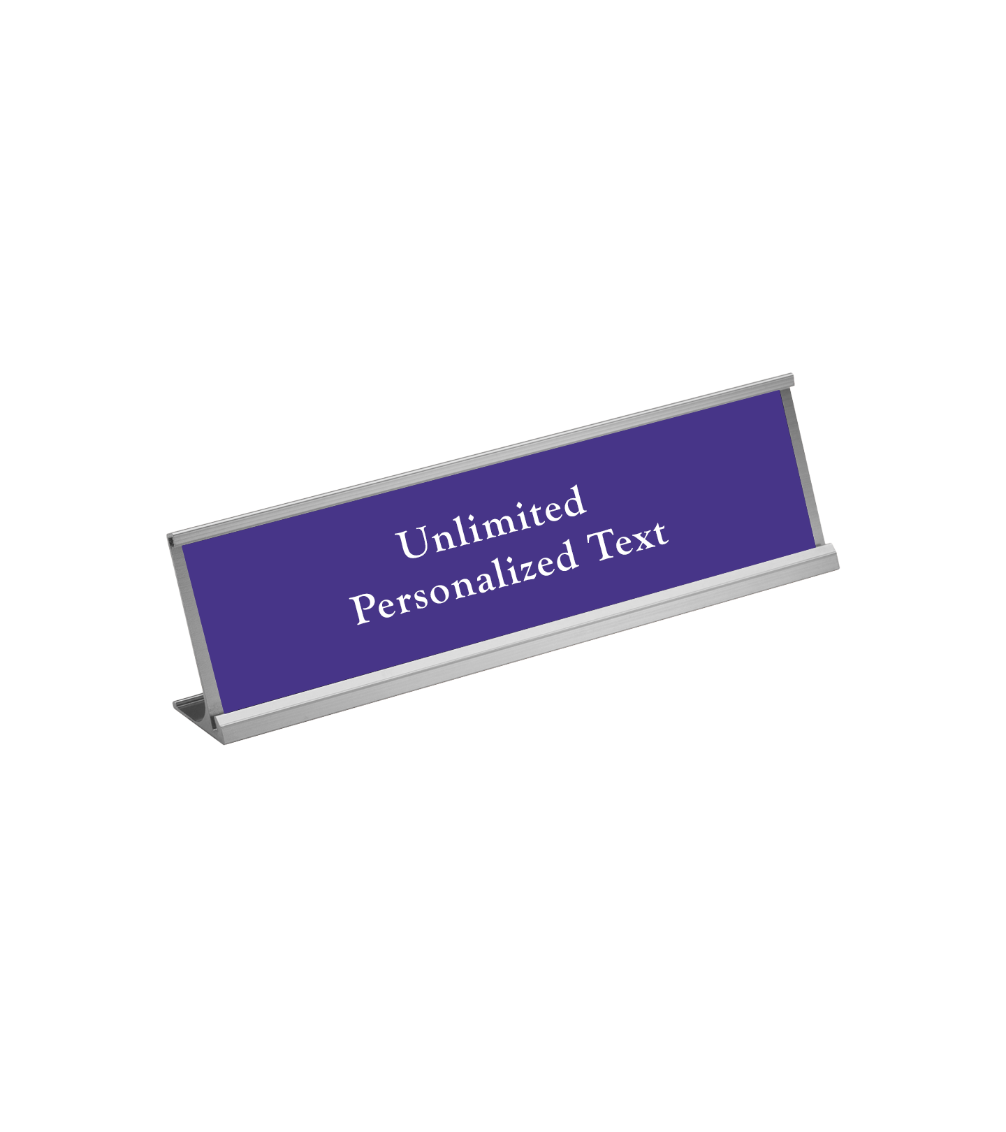 Silver Desk Name Plate Holder: Perfect for your desk. Holder is 2″ tall and either 8″ long or 10″ long. The plate slides into the frame which wraps around the back of it. And Lots of hard plastic plate color combinations to choose from.