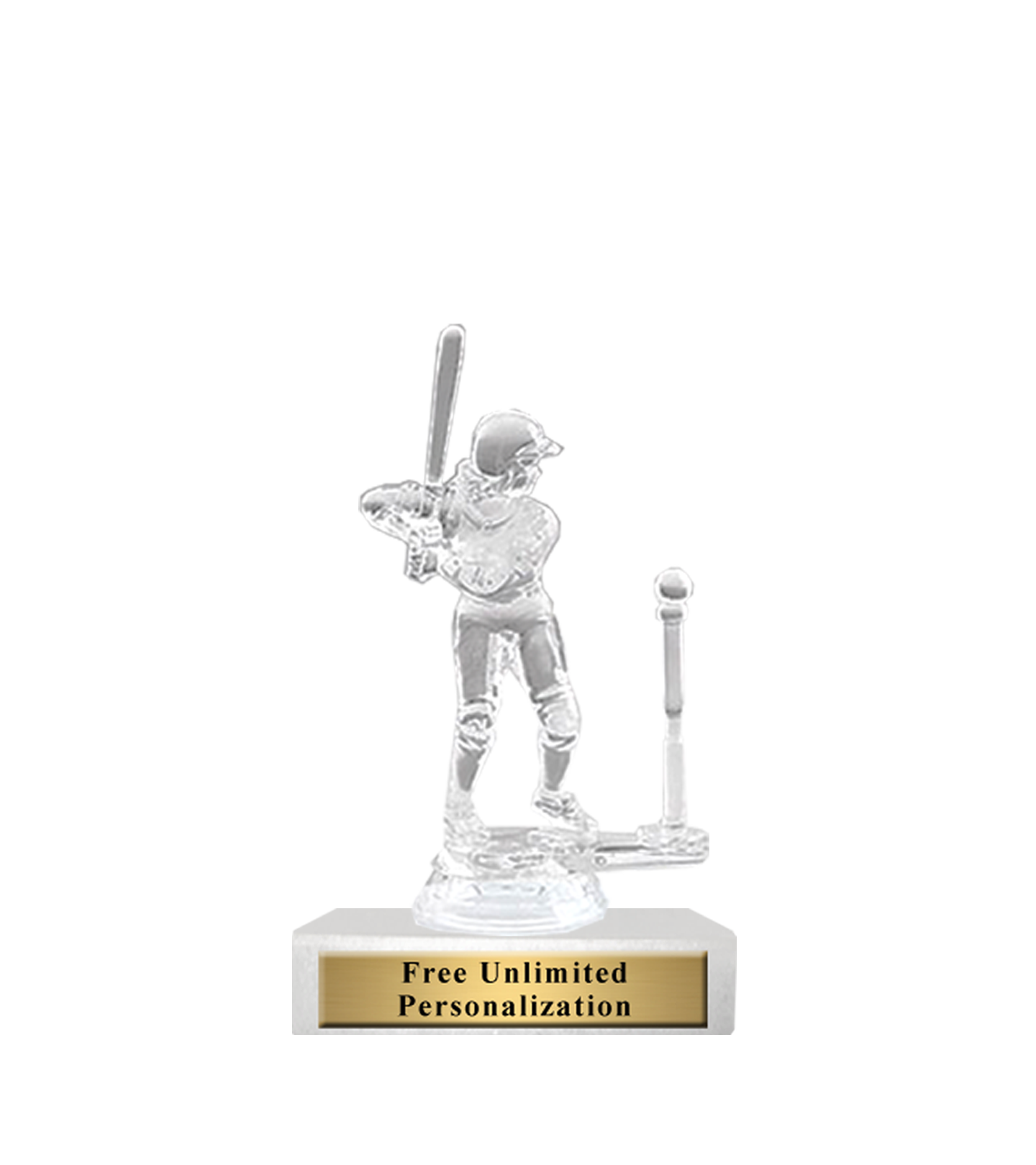 Celebrate your t-ball accomplishments with our stunning Clear Female T-Ball Trophy. The elegant white marble base and clear female T-Ball topper make for a visually striking display. Plus, enjoy unlimited personalization with free engraving!