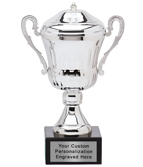 Delight guests with this unique silver cup with lid and black marble base. Adorned with a custom engraving, this one-of-a-kind piece will charm and impress. Bring a touch of grandeur to any celebration with this timeless cup!